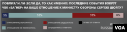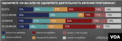 Согласно этим данным, до мятежа деятельность главы ЧВК поддерживало больше половины (55%) ответивших; это на 14% больше числа тех, кто заявил о своем отрицательном отношении к нему в начале года (при этом число относящихся к Пригожину отрицательно во время июньского опроса и опроса, проведенного 30 января – 6 февраля, примерно одинаковое – 14-15%).